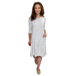 The dress features practical 3/4 length sleeves with flexible cotton rib construction, providing modest coverage while allowing comfortable movement. A patch pocket adds both contemporary style and functionality to this versatile piece, perfect for carrying small essentials.
