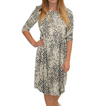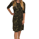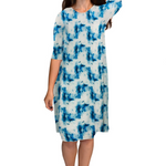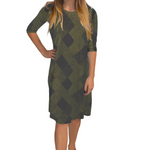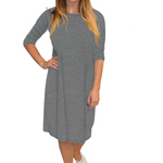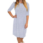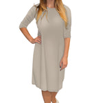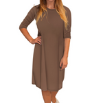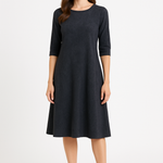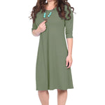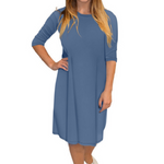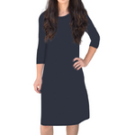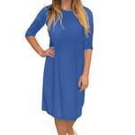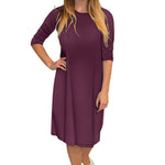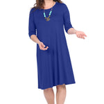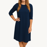Discover the perfect blend of comfort and style with our classic knee length T-Shirt Dress. Featuring a modest neckline and 3/4 length sleeves, this dress is designed for effortless wear throughout the day. The flattering A-line silhouette gracefully hits at the knee, making it a versatile choice for both casual outings and dressier occasions. Its soft, stretchy lightweight knit fabric ensures all-day comfort, while the viscose-spandex blend adds a touch of stretch for a perfect fit.