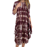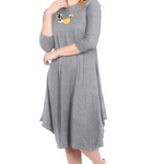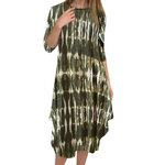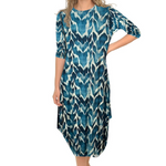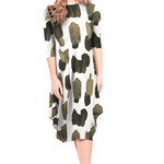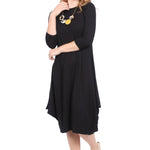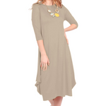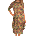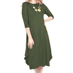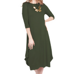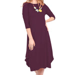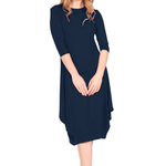 Discover our trendy flared dress combines style and modesty in a flowing design that works for any occasion. The soft viscose-spandex fabric creates an elegant silhouette with a roomy fit for natural movement. The dress dramatically drapes to a graceful midi length and the jewel neckline sits perfectly at the collarbone. Three-quarter sleeves extend past the elbows.