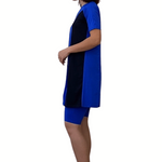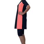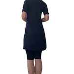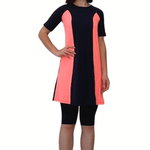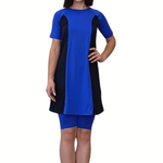 Perfect for the modesty-conscious swimmer, this sophisticated two-piece swim set features an above-knee length dress with coordinating knee-length leggings. The dress is thoughtfully designed with a high neckline, elbow-length sleeves, and elegant contrasting side panels that create a flattering silhouette. The separate knee-length leggings provide additional coverage and comfort with a smooth, covered elastic waistband.
