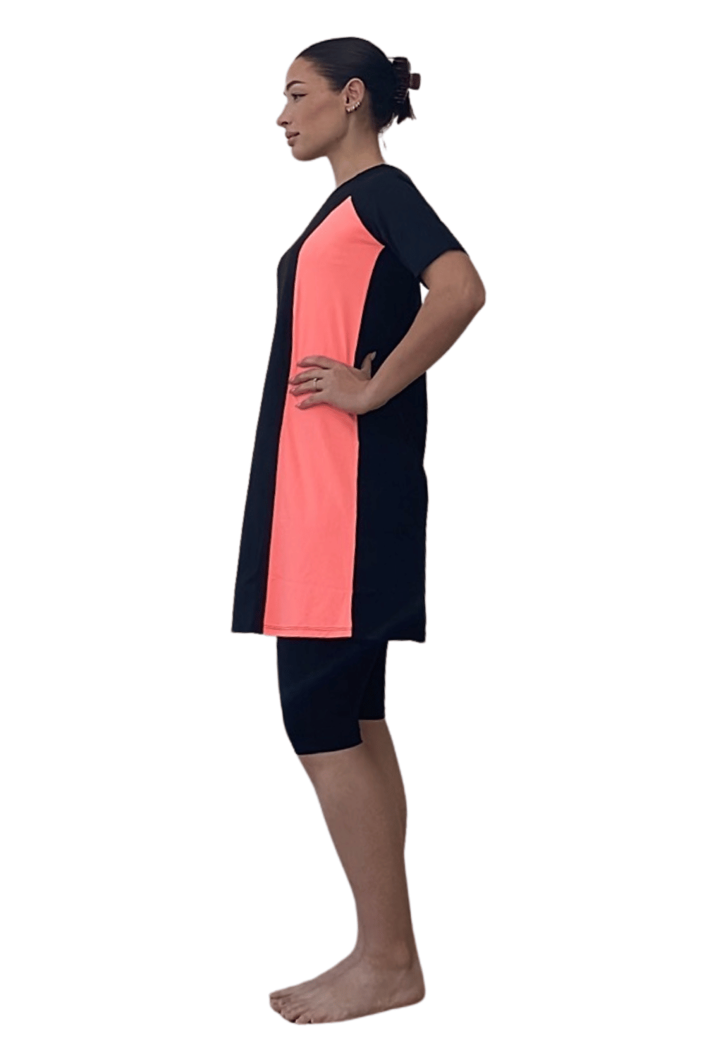 Perfect for the modesty-conscious swimmer, this sophisticated two-piece swim set features an above-knee length dress with coordinating knee-length leggings. The dress is thoughtfully designed with a high neckline, elbow-length sleeves, and elegant contrasting side panels that create a flattering silhouette. The separate knee-length leggings provide additional coverage and comfort with a smooth, covered elastic waistband.