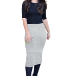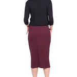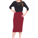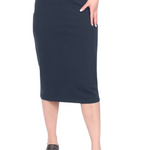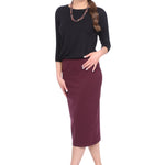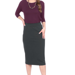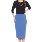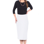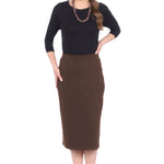 This beautifully tailored pencil skirt is combines style with modesty, featuring a comfortable 2-inch stretch waistband that sits smoothly at your natural waist. The streamlined design extends to mid-calf, whether standing or sitting, with no slits for complete modesty.