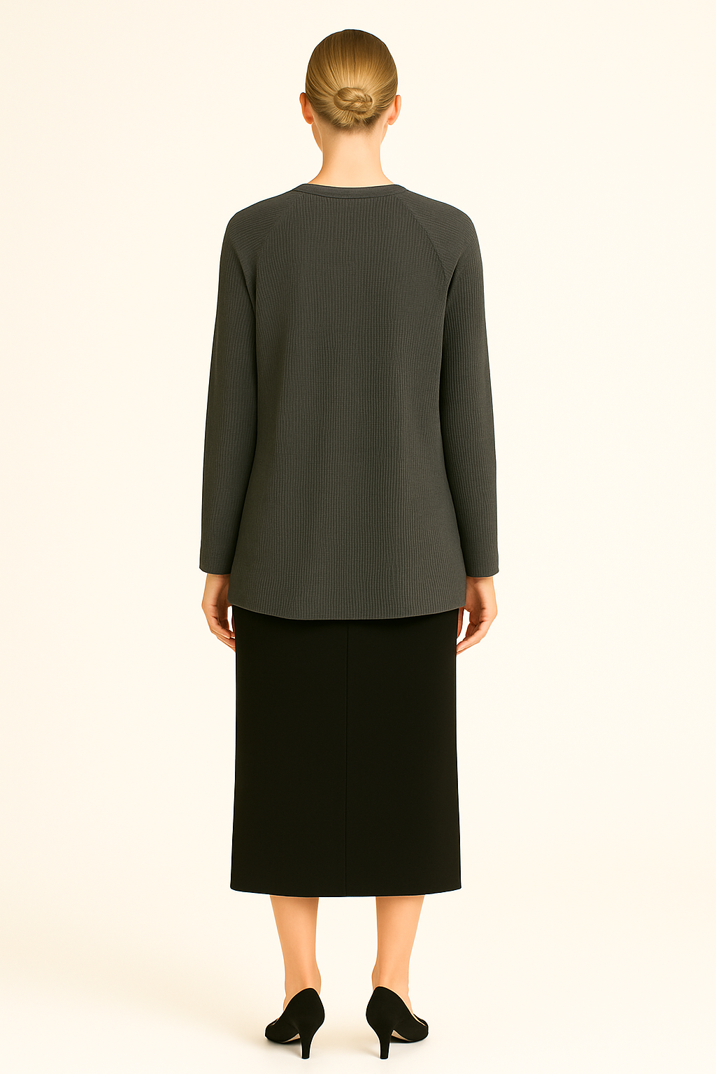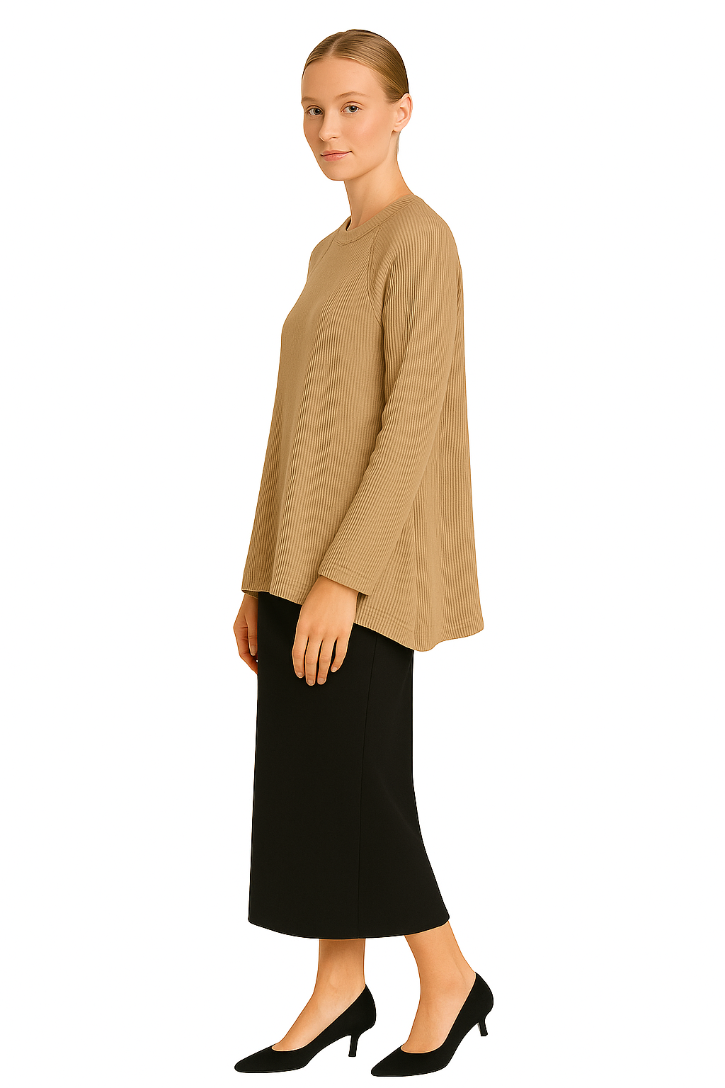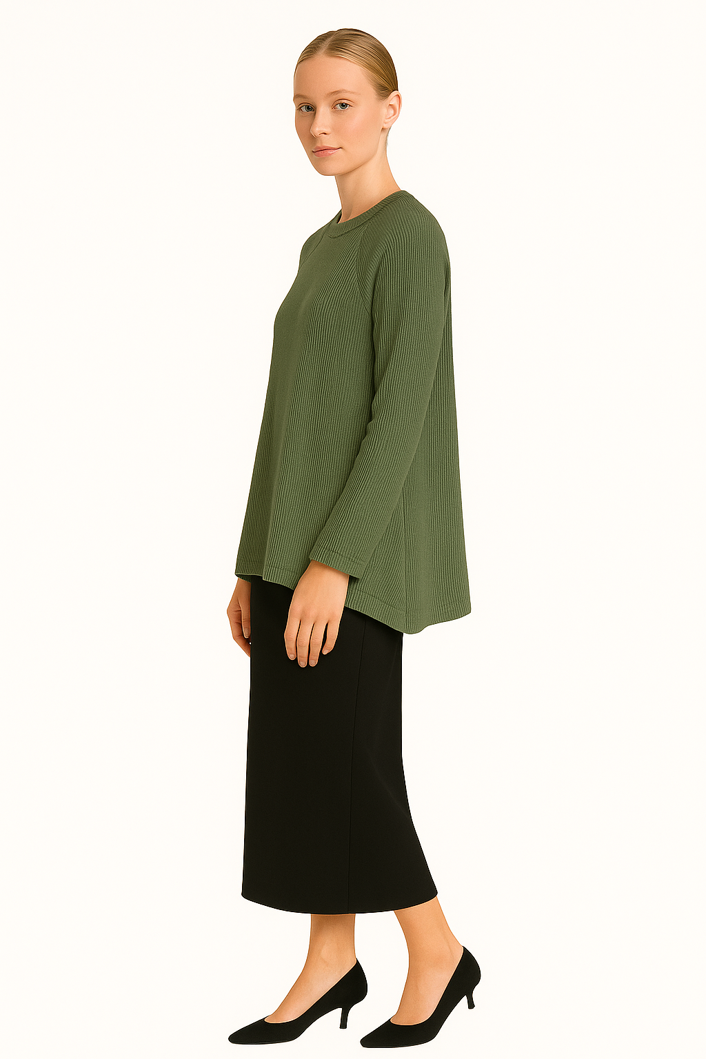 - Ribbed crew neckline sitting on the collarbone