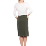 Experience the ease of our elegant modest knee-length pencil skirt, with a subtle sheen perfect for work or dressy occasions. The straight silhouette has a smooth covered elastic waistband, pull-on styling and is wrinkle-resistant nylon polyester spandex blend. This chic modest stretch skirt transitions seamlessly from office meetings to dressy occasions, making it an ideal choice for your perfect day to dinner skirt with effortless style.
