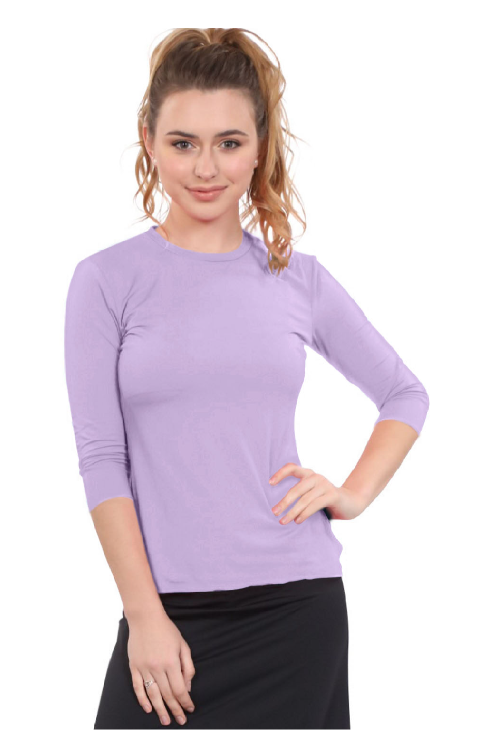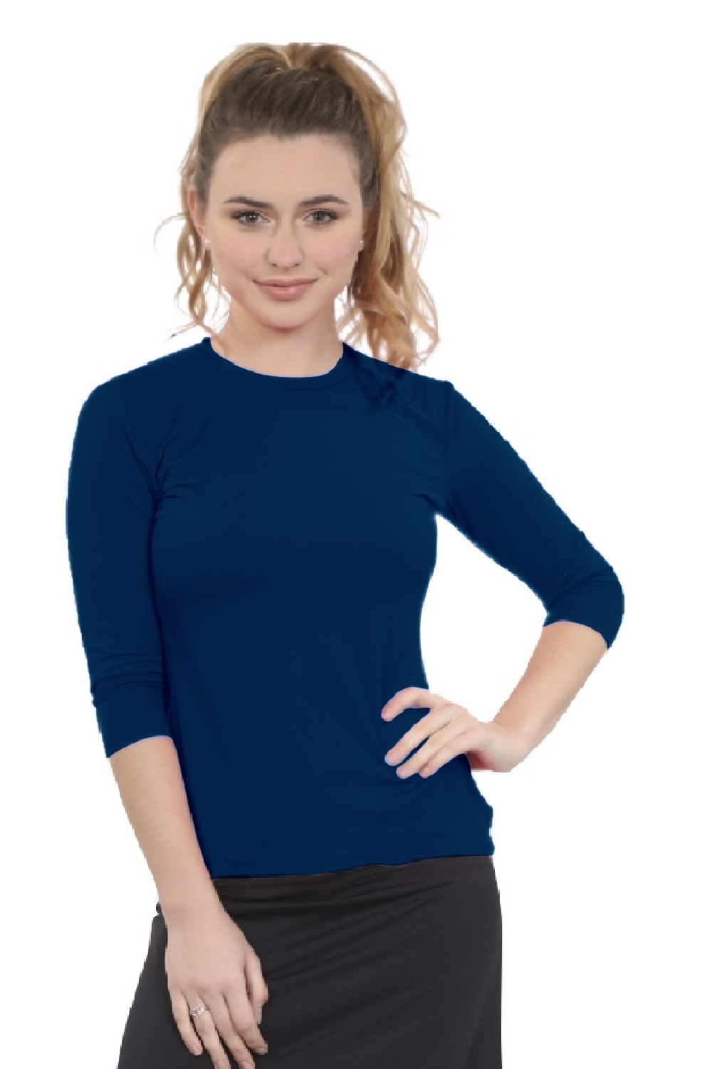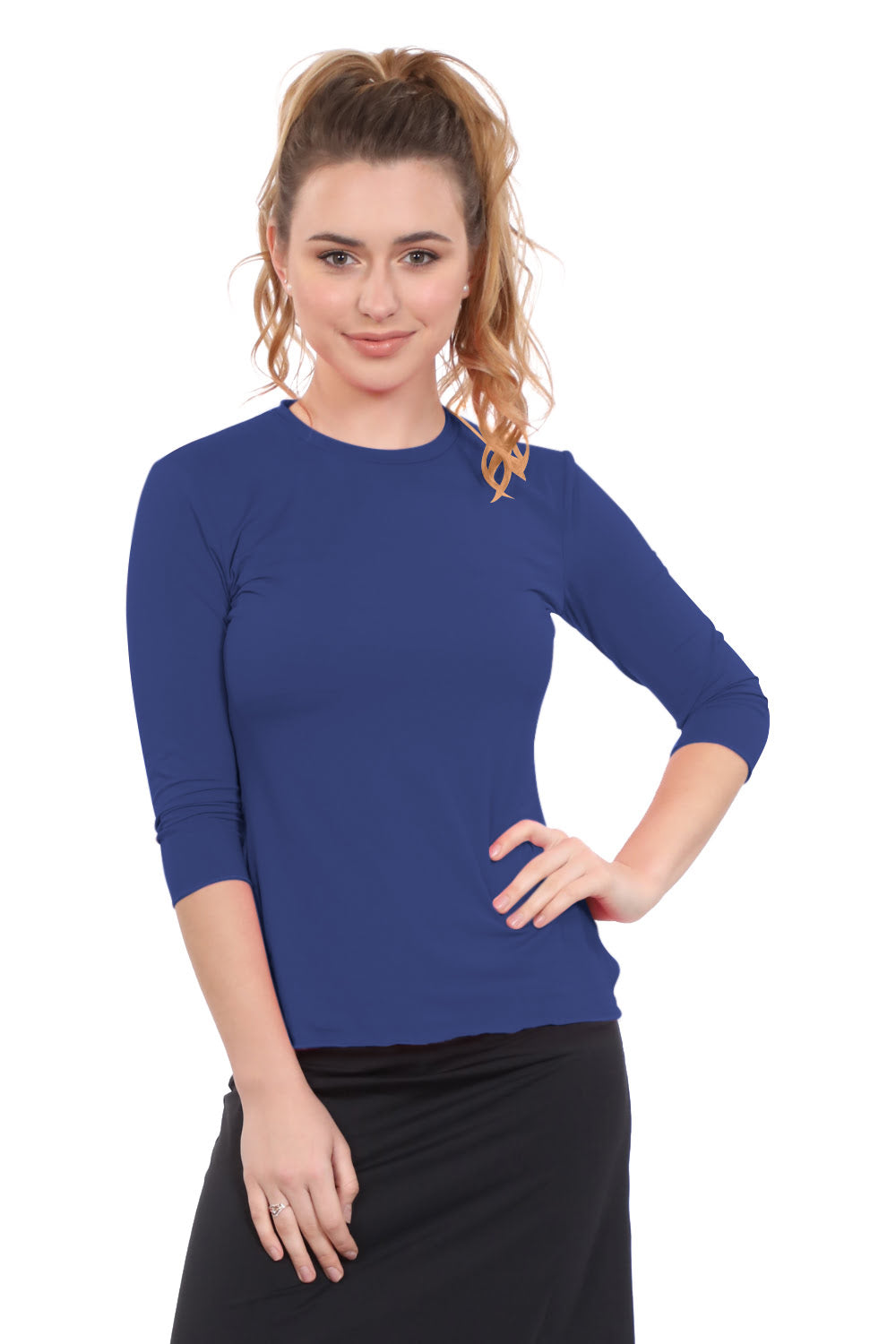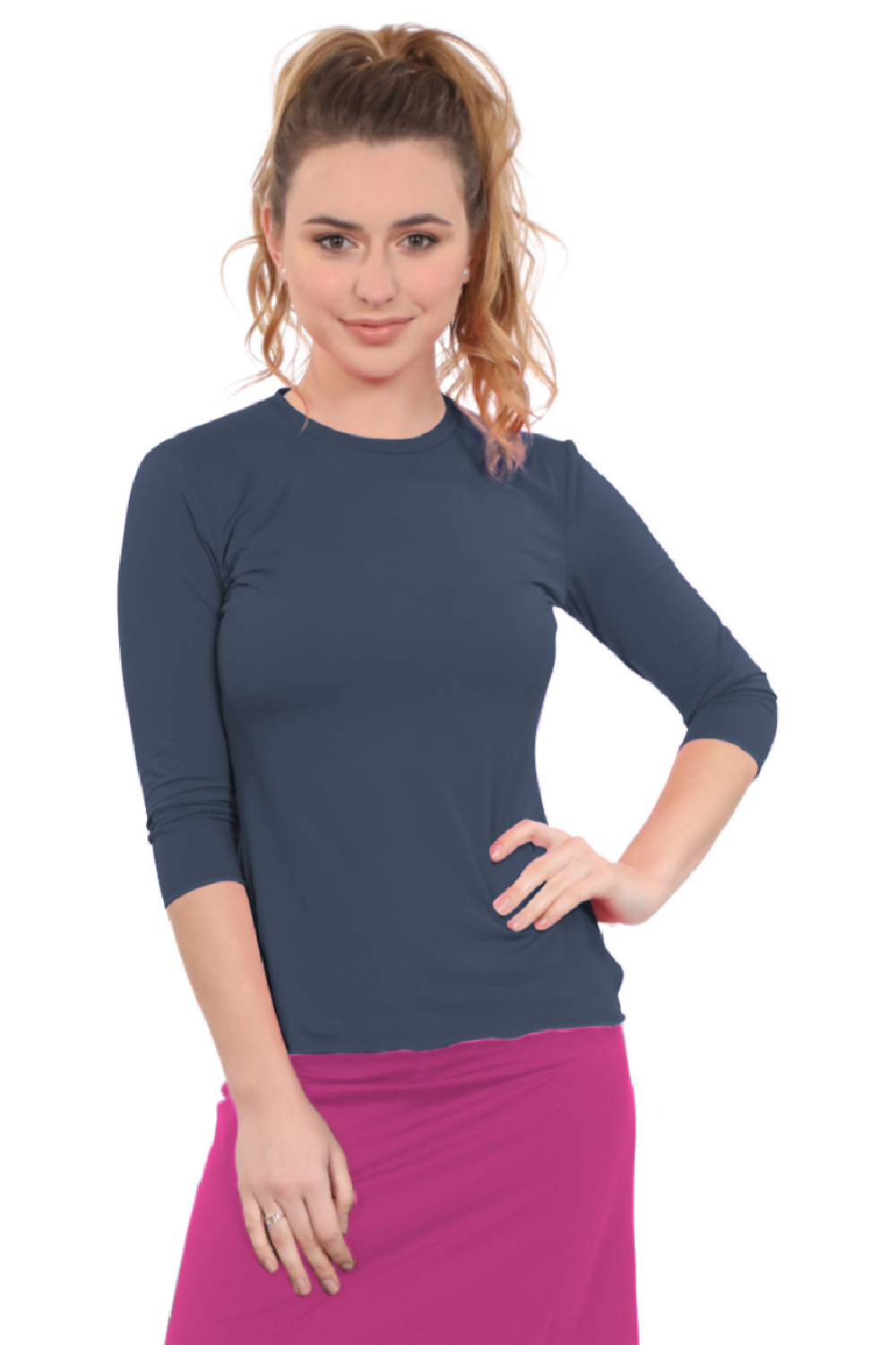 Designed for swimming and exercise, our looser fit 3/4 sleeve top is ideal for active women seeking modest athletic wear. The roomier fit silhouette features Side slits for ease of movement and a tapered waist that stays in place during water activities, while the double-layered front chest area provides extra modesty. The clean lines of the banded neckline and simple stitching details add style without compromising modest standards. The 88% Polyamide and 12% Spandex creates a stretchy, chlorine-resistant fabric that dries quickly, making transitions between activities seamless.