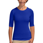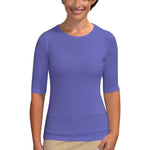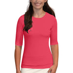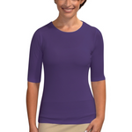 Specifically designed as a close-fitting base layer, this essential shell provides the perfect foundation for your layered outfits. The sleek, form-fitting design features a modest high round neckline that sits comfortably at or just below the collarbone, while the elbow-length sleeves provide versatile coverage. The streamlined silhouette eliminates bulk under your clothing, making it ideal for layering.