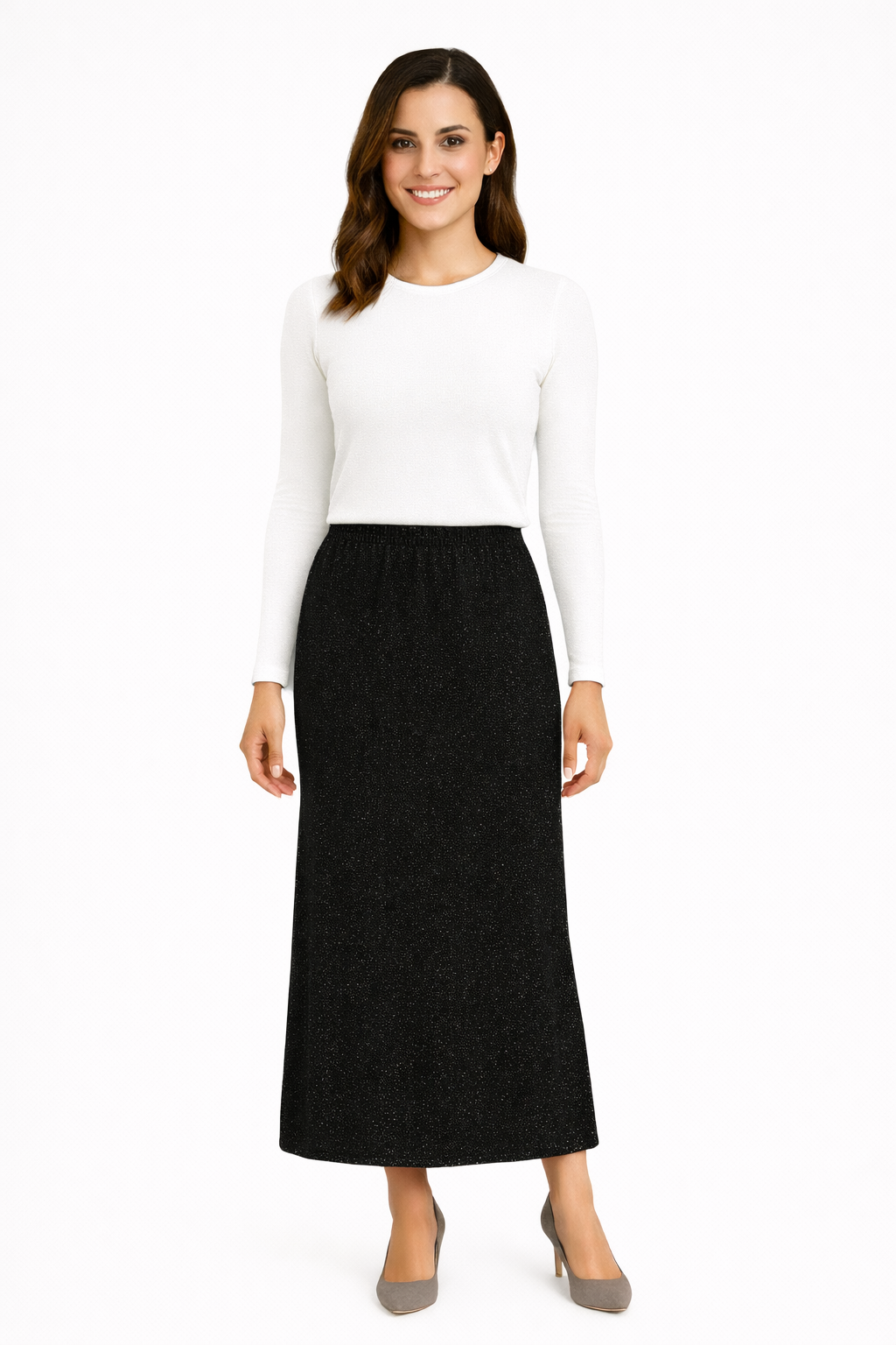 This skirt works beautifully as a standalone piece or paired with our Modest Long Sleeve Sparkle Rib Handkerchief Hem Tunic—crafted in the same premium sparkle knit fabric for a coordinated, intentional outfit. The subtle shimmer is also versatile enough to coordinate beautifully with any tops in your wardrobe, giving you endless styling possibilities. The pull-on waistband means effortless dressing, while the quality sparkle knit fabric ensures this skirt becomes a treasured go-to piece for years to come.