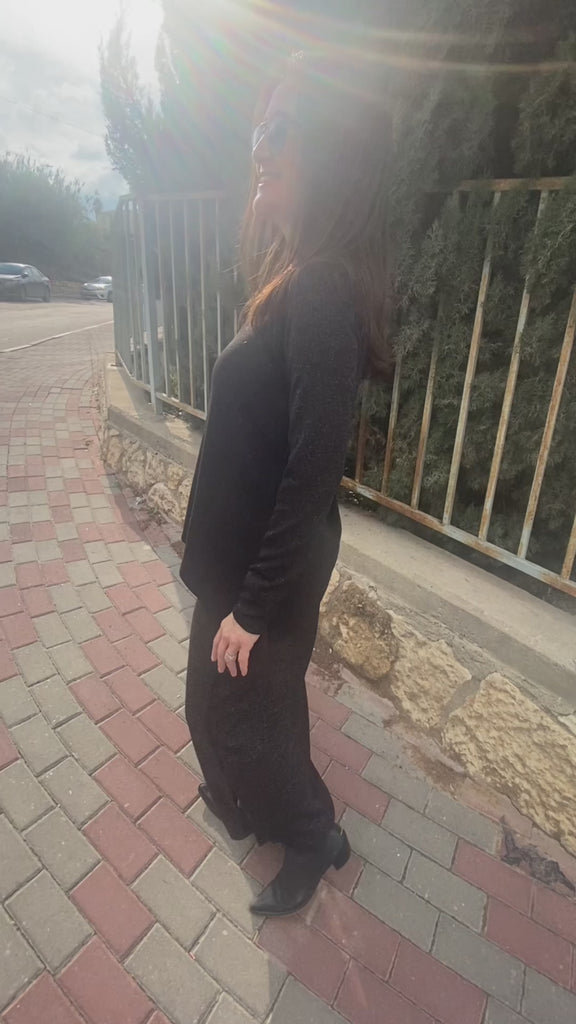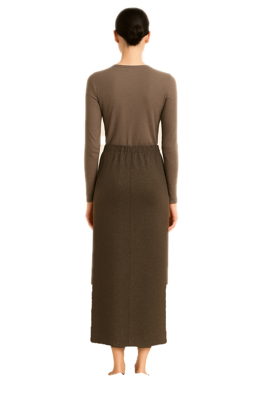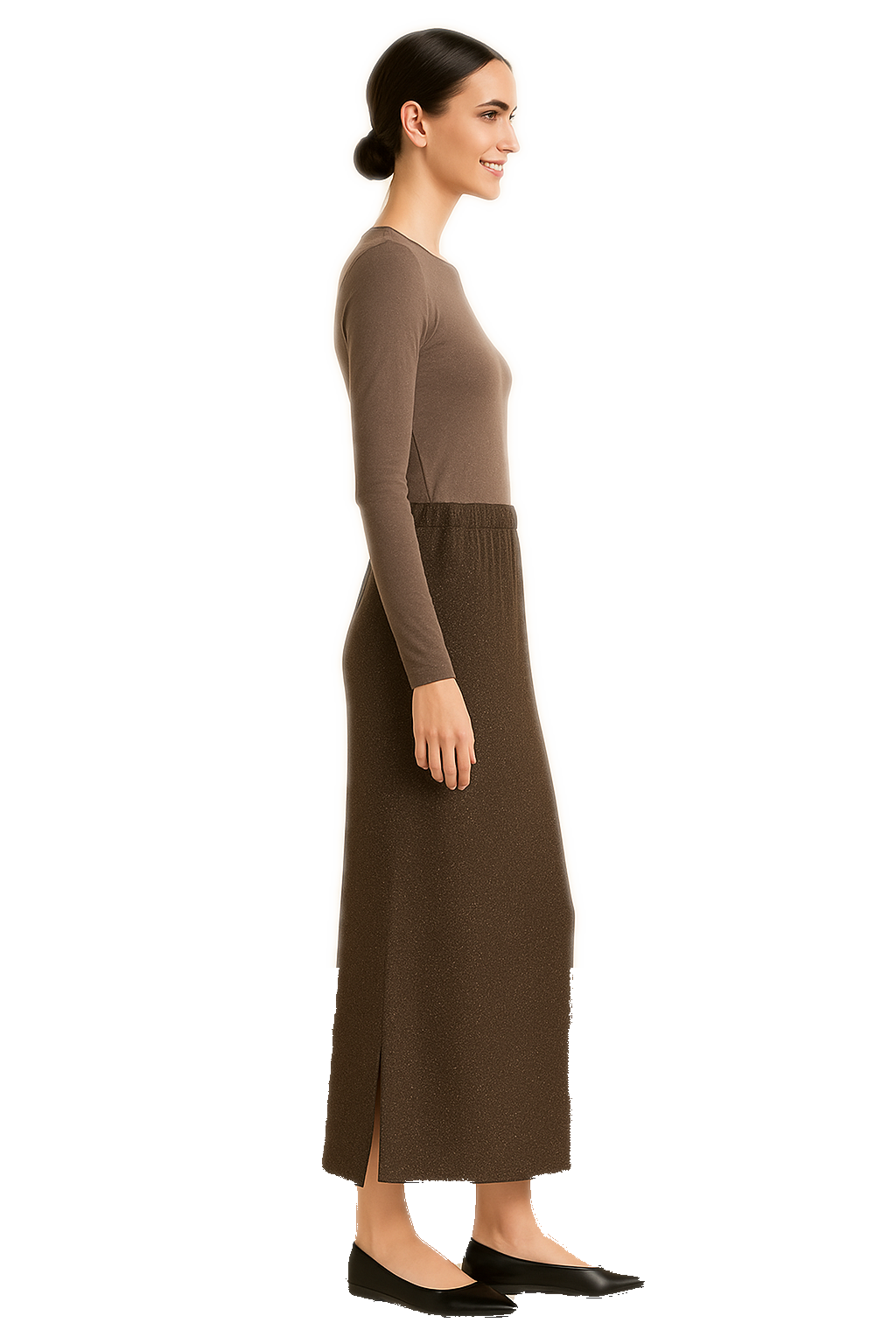 Designed for women who refuse to compromise between modest style and everyday elegance, this tapered sparkle knit maxi skirt elevates any occasion. The luxurious premium fabric—95% polyester, 5% spandex—features silver thread woven throughout, creating a noticeable shimmer that catches the light beautifully without being overdone. The structured knit creates a refined silhouette that flatters without clinging, and the unlined design keeps you comfortable all day and evening long. Strategic side slits positioned well below the knee provide subtle movement and styling flexibility while keeping you covered exactly how you want to be.