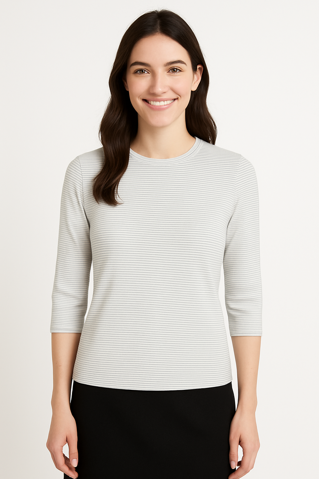 Experience effortless comfort in our lightweight ribbed fitted tee, featuring an elegant high neckline with sleek binding trim. This carefully crafted tee offers a flattering silhouette with three-quarter length sleeves, providing the perfect balance of style and coverage. The streamlined fit contours gracefully while maintaining complete comfort and modesty.