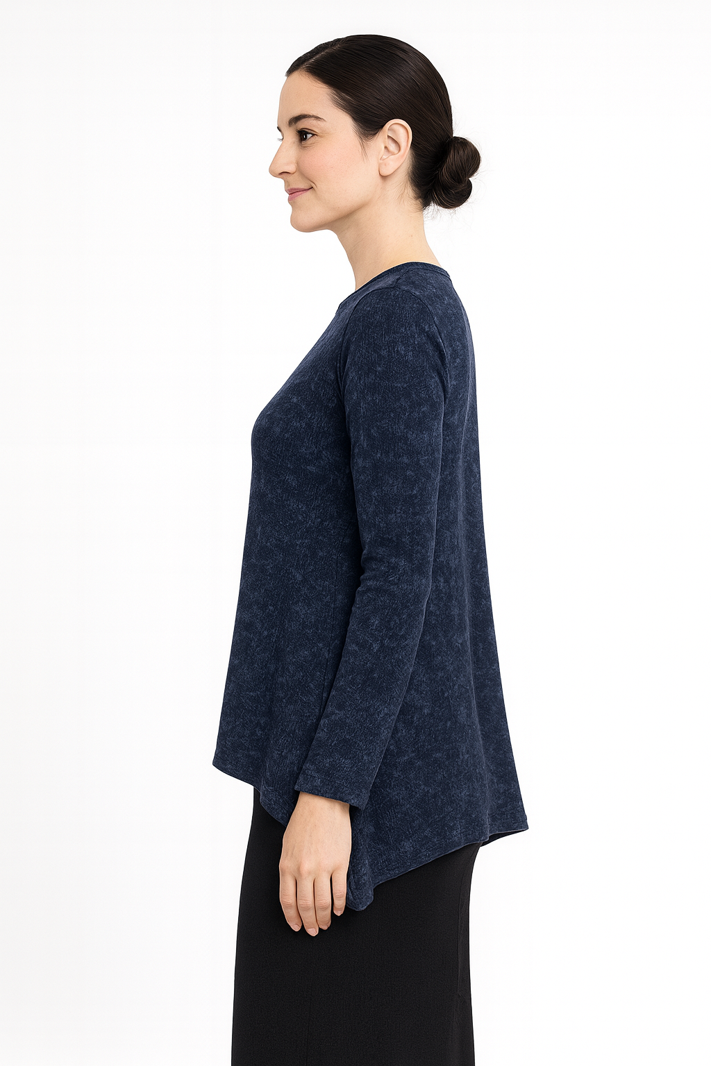 Modest Long Sleeve Handkerchief Tunic Top - Muted Tie-Dye Ribbed Knit