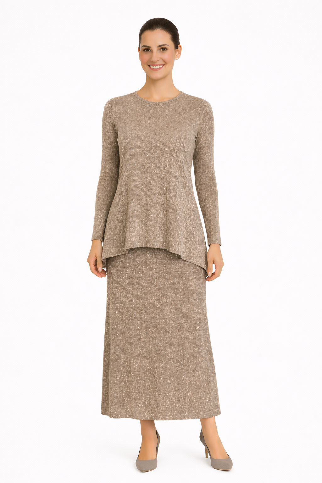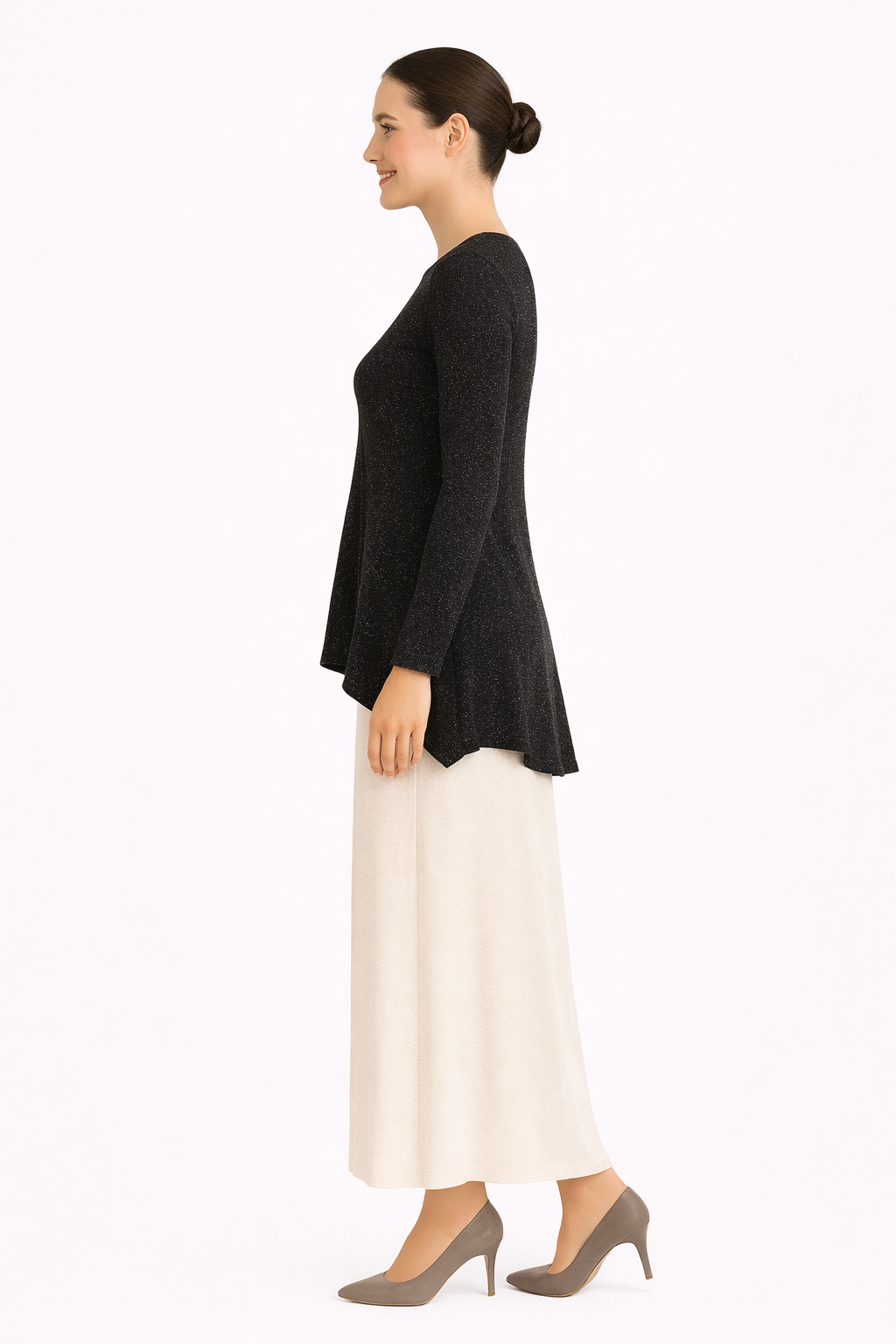 This long sleeve tunic top brings elegant sparkle to your modest wardrobe. The graceful handkerchief hem creates a flattering silhouette with a subtle hi-lo hemline. The modest round neckline sits comfortably at the collarbone, paired with long sleeves for complete coverage. Perfect for parties, holiday celebrations, and special occasions where you want to dress up while maintaining modest style.