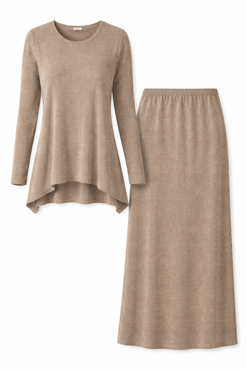 Made from our premium sparkle knit fabric—95% polyester, 5% spandex—with silver thread woven throughout for a noticeable shimmer. The fabric drapes beautifully and holds its shape through regular wear and washing. Machine washable and easy to care for. A coordinating tapered maxi skirt is available separately.