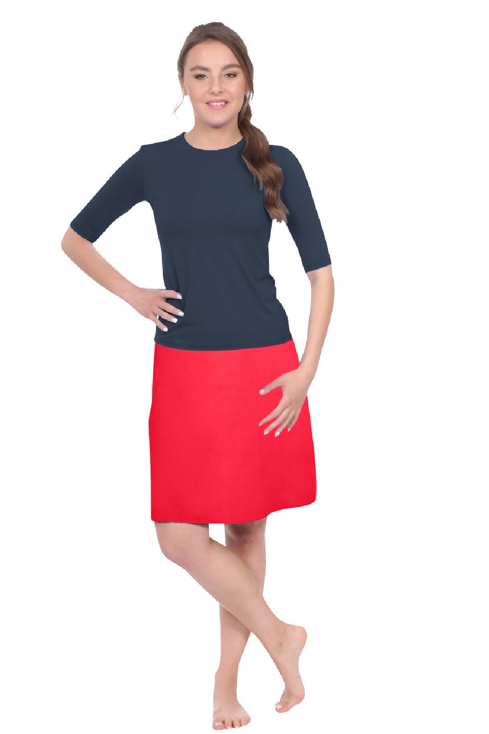 Stay comfortably modest in our knee-length Swim/Sport Skirt designed for your active lifestyle. The secure built-in shorts underneath provide worry-free movement, convenient zippered rear pocket and stretchy elastic waistband holds the skirt perfectly at your natural waist. Made with high quality of 88% Polyamide and 12% Spandex, the fabric is chlorine-resistant, quick-drying for convenience, and includes UPF 50+ protection. Easy modest dressing in this skirt perfect for swimming, running, working out, or everyday activities, ideal for the pool, beach, and outdoor sports.